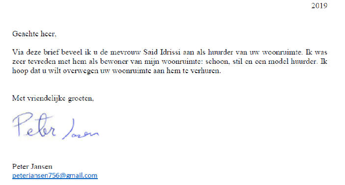 Translation: Dear Sir, Through this letter I recommend Mrs. Said Idrissi as a tenant of your living space. I was very satisfied with him as a resident of my living space: clean, quiet and a model tenant. I hope you want to consider renting out your living space to him. With best regards, Peter Jansen